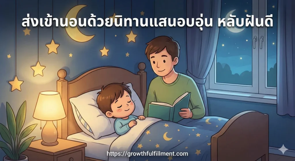 บทนำ: สงครามยามดึก หรือ ช่วงเวลาแห่งเวทมนตร์? คุณเลือกได้ "แม่จ๋า ขอน้ำกินหน่อย", "พ่อครับ ผมยังไม่ง่วง", "ขอฟังอีกเรื่องเดียวนะ"... เชื่อว่าประโยคเหล่านี้คือ "เสียงประกอบฉาก" ที่คุ้นหูในหลายๆ บ้านเมื่อเข็มนาฬิกาชี้บอกเวลาเข้านอน สำหรับคุณพ่อคุณแม่หลายท่าน ช่วงเวลาเข้านอนอาจเปรียบเสมือนสมรภูมิรบขนาดย่อมที่ต้องใช้ทั้งพลังกายและพลังใจในการกล่อมเจ้าตัวเล็กให้ยอมหลับตาลง แต่จะดีแค่ไหนคะ? ถ้าเราสามารถเปลี่ยนช่วงเวลาที่วุ่นวายนี้ ให้กลายเป็นช่วงเวลาที่เงียบสงบ อบอุ่น และเต็มไปด้วยเวทมนตร์... เวทมนตร์ที่ไม่ได้มาจากไม้กายสิทธิ์ แต่มาจาก "หนังสือนิทานหนึ่งเล่ม" และ "เสียงของคุณ" ภาพที่คุณพ่อคุณแม่เห็น (จากรูปประกอบ) คือเป้าหมายที่เราอยากให้เกิดขึ้นในทุกบ้าน ภาพของลูกน้อยที่นอนฟังนิทานตาแป๋วในบรรยากาศแสงไฟสลัว อบอวลไปด้วยความรักและความปลอดภัย วันนี้ Growth Fulfillment จะพามาเจาะลึกว่า…