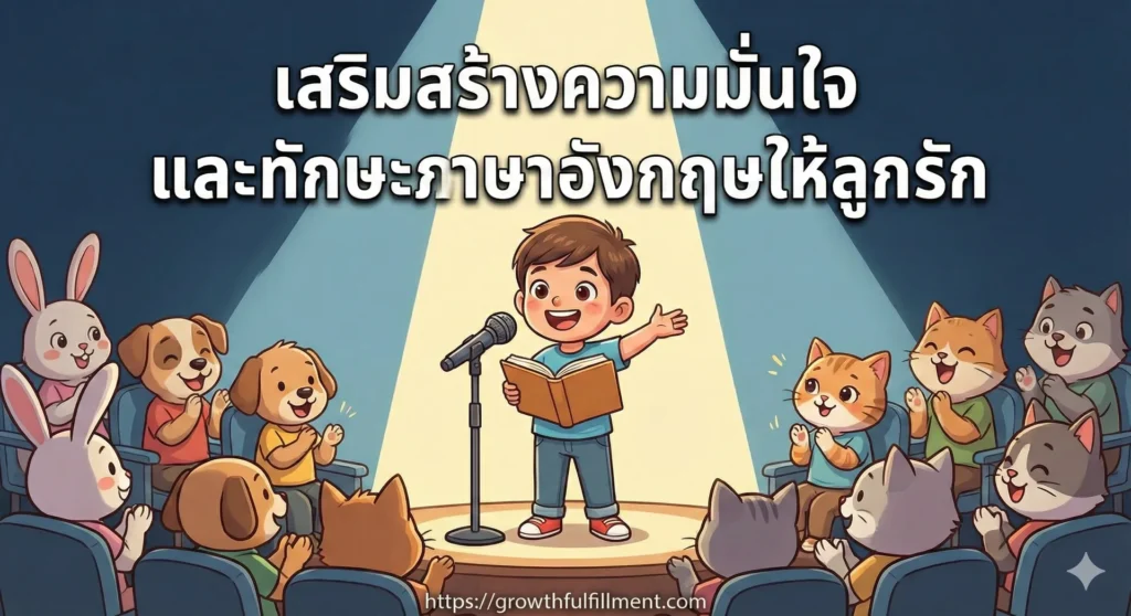 เวทีนี้หนูทำได้! ปั้นลูกให้เก่งอังกฤษและกล้าแสดงออก ผ่าน "เวทีนิทาน" ในบ้าน บทนำ: เพราะความมั่นใจ ไม่ได้สร้างเสร็จในวันเดียว "ไม่เอาครับ แม่อาย...", "หนูไม่กล้าพูดหน้าห้อง..." คุณพ่อคุณแม่เคยได้ยินประโยคเหล่านี้จากปากลูกไหมคะ? ความประหม่า ความกลัวการถูกจ้องมอง หรือการไม่กล้าพูดต่อหน้าคนเยอะๆ เป็นเรื่องปกติที่เกิดขึ้นได้กับเด็กทุกคน (และผู้ใหญ่หลายคนด้วย!) โดยเฉพาะเมื่อต้องพูดในภาษาที่ไม่คุ้นเคยอย่าง "ภาษาอังกฤษ" แต่ความมั่นใจเป็นทักษะที่ฝึกฝนได้ค่ะ และที่สำคัญที่สุดคือ... มันเริ่มต้นได้ง่ายๆ ที่ "บ้าน" ของเราเอง ลองจินตนาการตามภาพหน้าปกบทความดูสิคะ ภาพของหนูน้อยที่ยืนอย่างสง่าผ่าเผยภายใต้แสงสปอตไลท์ ถือไมโครโฟนเล่าเรื่องราวจากหนังสืออย่างออกรส โดยมีเหล่าตุ๊กตาสัตว์ตัวโปรดนั่งฟังตาแป๋วและปรบมือเชียร์ นี่ไม่ใช่แค่ภาพการ์ตูนน่ารักๆ แต่คือ "เทคนิคจิตวิทยา" ที่ทรงพลังในการปลดล็อกศักยภาพของลูก วันนี้ Growth…